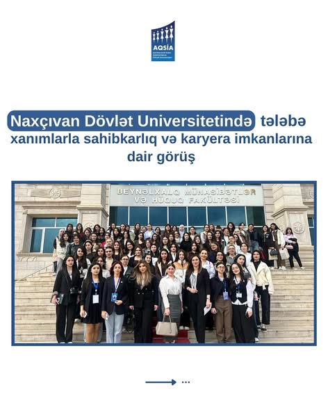**Azərbaycanda Qadın Sahibkarlığının İnkişafı Assosiasiyası**nın (AQSİA) təşkilatçılığı ilə **Naxçıvan Dövlət Universiteti**ndə tələbə xanımlar üçün sahibkarlıq və karyera imkanlarına həsr olunmuş görüş keçirilib.