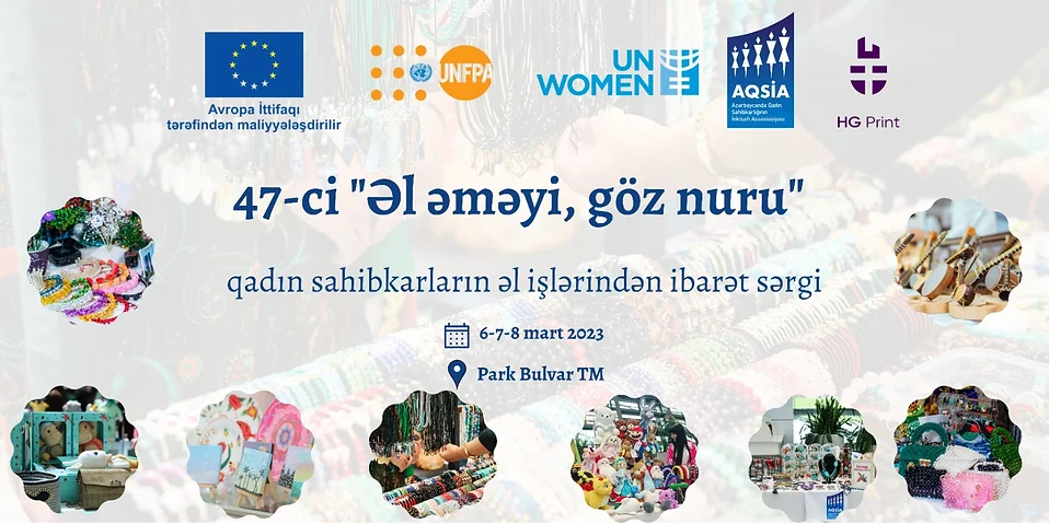 Sizi 6-8 Mart tarixində Azərbaycanda Qadın Sahibkarlığının İnkişafı Assosiasiyası tərəfindən təşkil olunan, Avropa İttifaqının maliyyələşdirdiyi, BMT-nin Qadınlar üzrə Agentliyi (UN Women) və BMT-nin Əhali Fondunun (UNFPA) birgə həyata keçirdiyi "Avropa İttifaqı Gender Bərabərliyi naminə: Birlikdə gender stereeotiplərinə və gender əsaslı zorakılığa qarşı" proqramının dəstəyi ilə Bakıda AQSİA-nın kiçik sahibkarlarının əl işlərinin satışının keçirildiyi “47-ci Əl əməyi, göz nuru” sərgisində iştirak etməyə dəvət dəvət edirik.