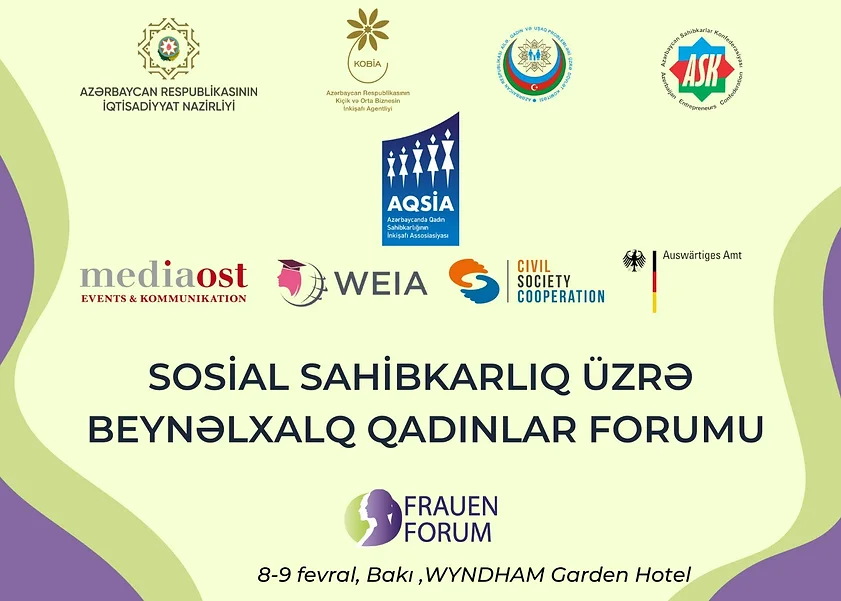 Sizi 8-9 fevral tarixində Azərbaycanda Qadın Sahibkarlığının İnkişafı Assosiasiyası (AQSİA) beynəlxalq tərəfdaşları MediaOst və WEIA ilə birlikdə Bakıda keçiriləcək "Sosial Sahibkarlıq üzrə Beynəlxalq Qadınlar" Forumunda iştirak etməyə dəvət edirik.